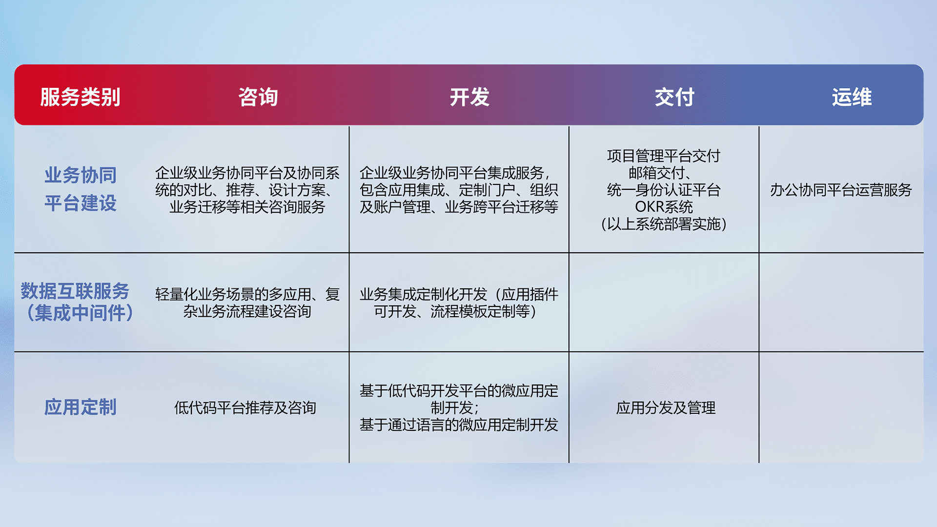 针对钉钉、、、、企微、、、IDaas等平台级产品提供产品的规划、、方案、、交付、、、、定制化开发等服务,,,实现如统一协同办公、、、智能客户服务、、、、混合会议管理、、智能数据查询、、等业务场景,,实现数字化转型。。